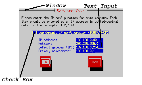 Button widget — кнопки — основной способ взаимодействия с программой установки. Вы продвигаетесь по окошкам программы установки, выбирая и нажимая ту или иную кнопку (с помощью кнопок клавиатуры <KEYCAP >Табуляция ([Tab])<KEYCAP > и <KEYCAP >[Enter]<KEYCAP >). Кнопки могут быть выбраны, когда они подсвечены.