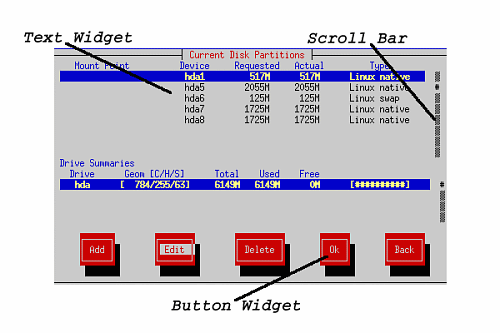 Text widget — области экрана для отображения текста. Иногда они содержат в себе другие элементы, вроде checkbox'ов. Если вся информация не помещается, появляется полоса прокрутки; поместив курсор внутри текстового поля, вы сможете пользоваться стрелочками <KEYCAP >[Вверх]<KEYCAP > и <KEYCAP >[Вниз]<KEYCAP >, чтобы добраться до непоместившейся информации. Текущее положение изображается на полосе прокрутки символом # который следует вашим перемещениям — вверх или вниз.