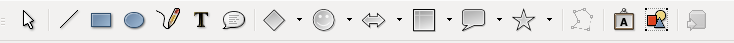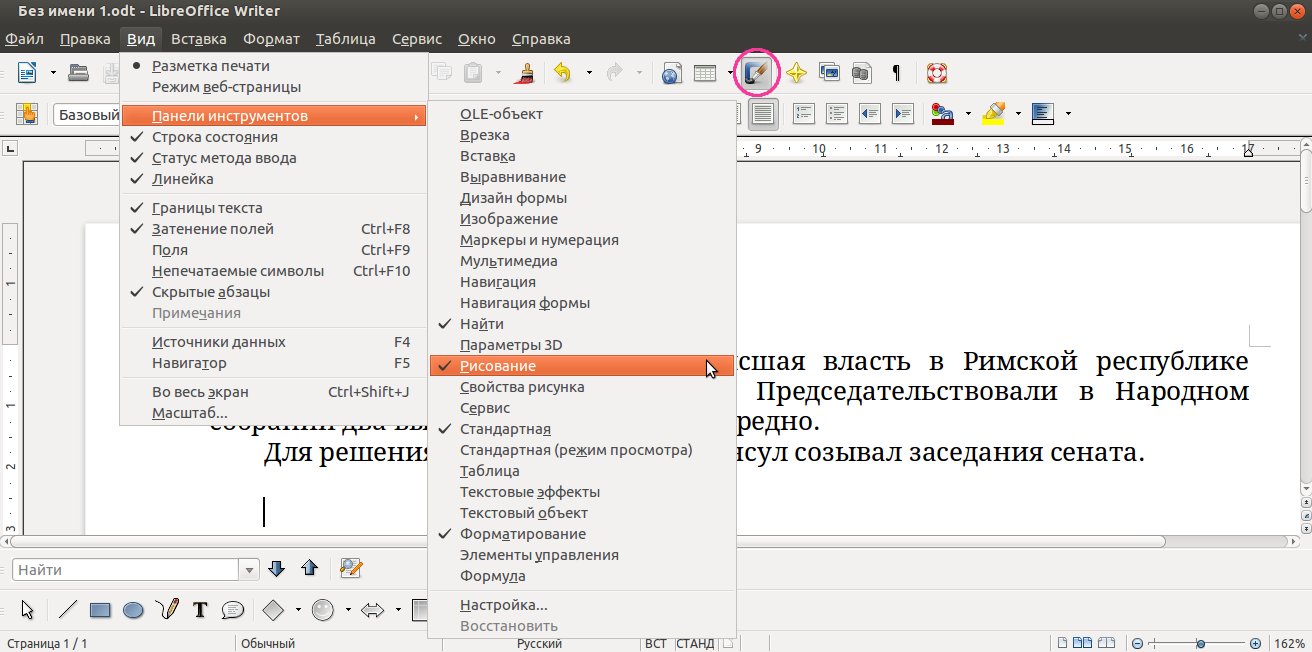 Основными инструментами в данном случае будут те, которые позволяют создавать и изменять графические примитивы. Они расположены на панели инструментов Функции рисования. Включить ее можно двумя способами. Можно просто нажать на кнопку Функции рисования, на иллюстрации она обведена красным кружком. Второе нажатие убирает панель. Или можно включить панель через меню Вид -> Панели инструментов -> Рисование. В любом случае панель появится внизу слева. Сделанная настройка действует до принудительного отключения панели. Это значит, что панель рисования будет появляться при каждом запуске LibreOffice Writer, если она не была отключена.