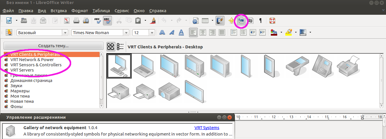 Окно LibreOffice Writer с включенной Галереей и установленным расширением Gallery of network equipment.