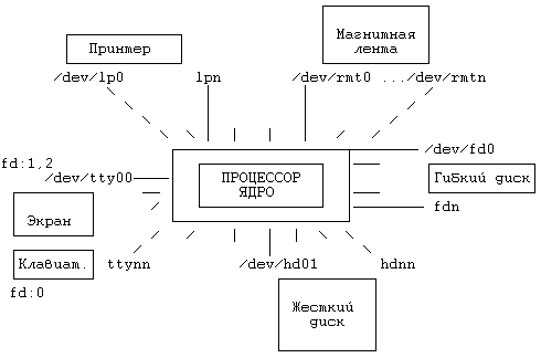 UNIX обращается к периферийным устройствам через "специальные файлы". Имеется два типа специальных файлов: блочные и символьные. Оба типа имеют свое предназначение и особенности. Блочный (например, /dev/hd0) использует буферизацию и позволяет получить доступ к большим объемам данных на жестком диске. Символьный (например, /dev/tty00 или /dev/rfd0) не использует значительную буферизацию, а выполняет обмен с устройством по одному символу за обращение. Даже несмотря на особые свойства таких файлов, для них поддерживается все тот же механизм защиты, что и для всех других файлов в системе.