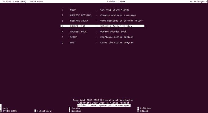 Рассмотрение работы с Alpine лежит за пределами текущей статьи. Чтобы получить более подробную информацию о работе с почтовым клиентом вы можете пройти по ссылкам, приведённым в конце статьи. Все указанные материалы, на момент написания статьи, находятся в свободном доступе. Регистрация для ознакомления с ними не требуется.