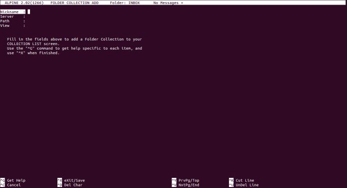 Итак, из главного окна Alpine перейдем в окно "SETUP" ("S"), а далее в настройки коллекций — "L". Для добавления новой коллекции нажмите клавишу "A" (не забывайте про подсказку внизу экрана). После чего попадете в окно "FOLDER COLLECTION ADD" (см. рис. 2). В поле "Nickname" вы можете ввести произвольное имя коллекции, под которым коллекция будет представлена в списке папок ("FOLDER LIST", из главного окна в неё можно попасть нажав "L"), например — user@gmail.com.