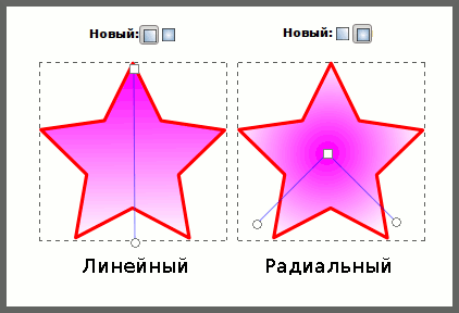Объект зальется градиентом. На рисунке 3 показана разница между линейным и радиальным градиентом.